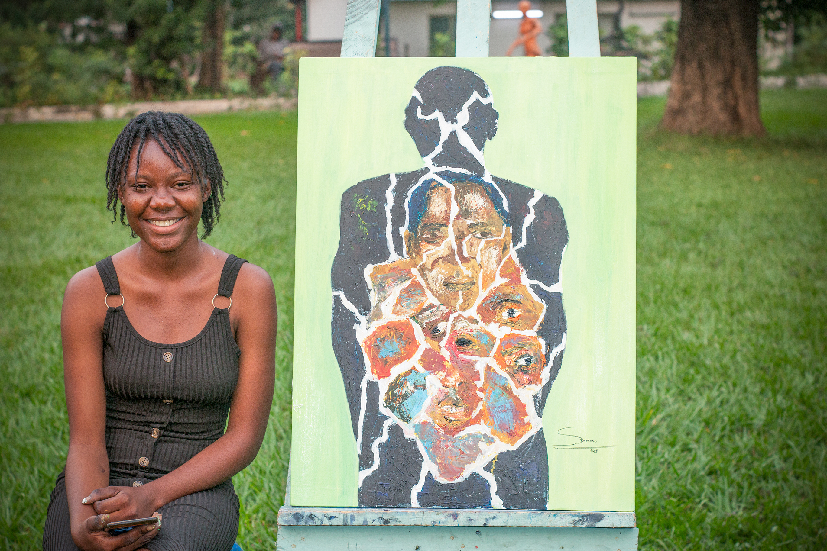 A fractured silhouette stands against a pale green backdrop, its surface cracked like porcelain to reveal a vibrant mosaic of faces and eyes within. Each fragment pulses with color—burnt orange, deep brown, electric blue—suggesting a chorus of identities layered beneath the skin. The white fissures evoke a sense of rupture, yet they also illuminate the hidden richness of the inner world. This figure is not broken but revealed, its complexity laid bare in a visual symphony of emotion and memory. The painting speaks to the multiplicity of self, the beauty in fragmentation, and the quiet power of introspection.